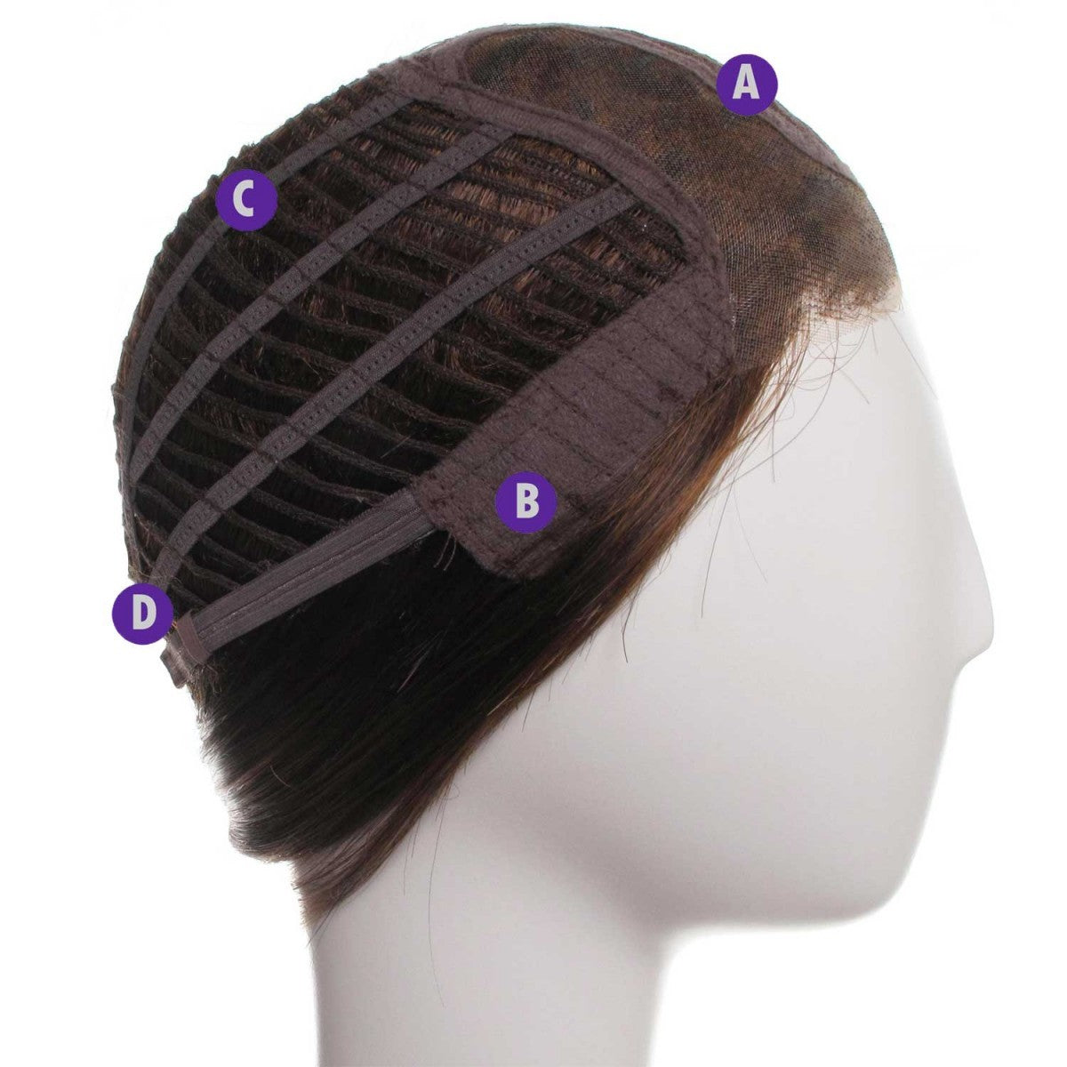 A Top and Crown: This wig features a closed section of patterned mesh material on the top and crown area to give the wig a realistic look. Soft comfort strips around the edges allow the wig to sit comfortably against the skin, giving it a similar texture to the scalp.